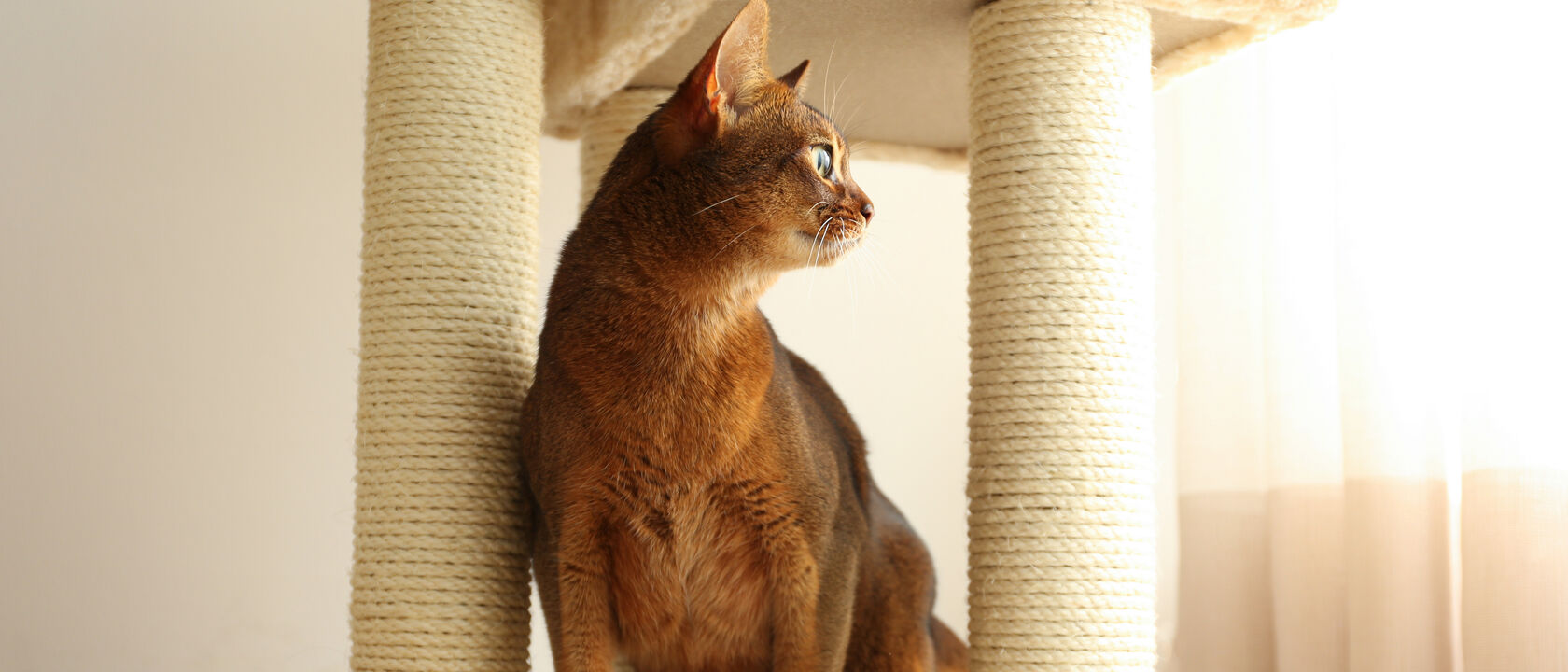 Gato usa arranhador perto de janela com plantas