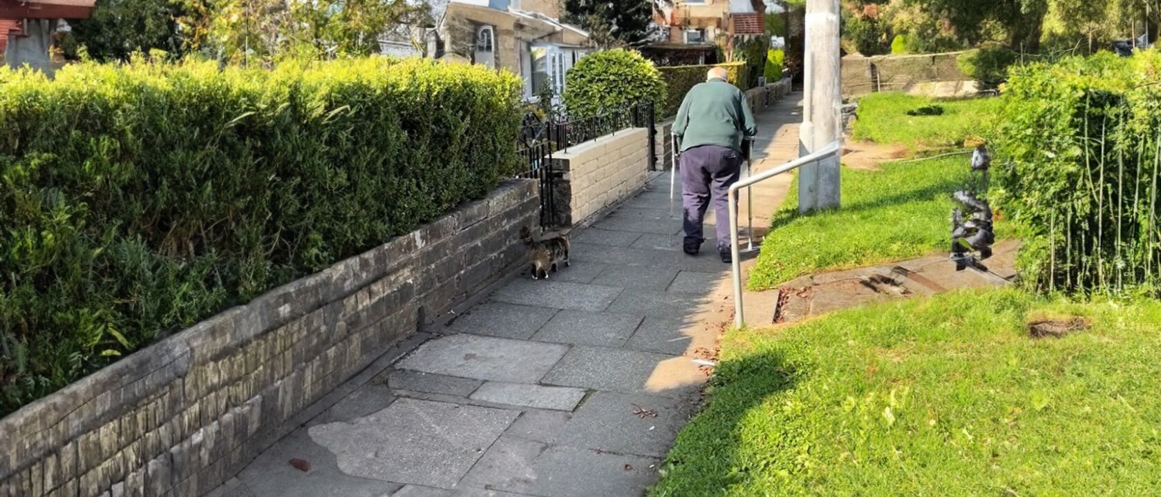 Com passos lentos e apoiado pela sua bengala, ele percorre as calçadas do bairro com determinação. Mas nunca está sozinho. Tattie, a sua fiel companheira, segue cada um dos seus passos, como se estivesse a cuidar dele, garantindo que, mesmo em silêncio, ele se sinta sempre acompanhado.